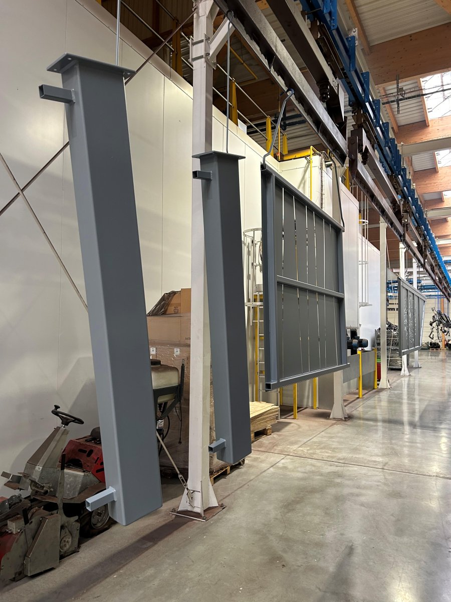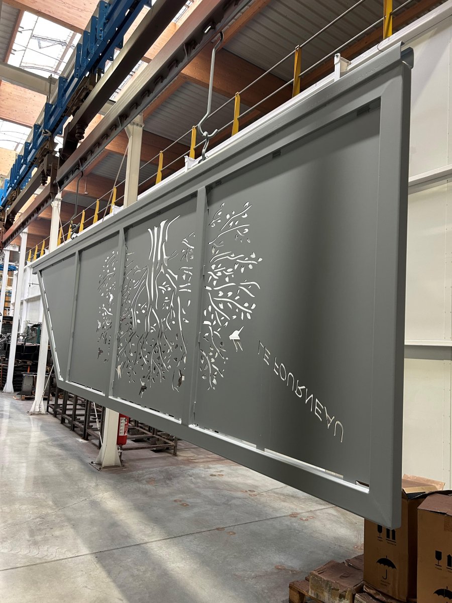 Le portail a ensuite été polymérisé à 180°C métal pendant 12 minutes, assurant une dureté de surface élevée et une résistance optimale aux intempéries. Le rendu final offre une finition brillante et homogène, parfaitement adaptée à une utilisation extérieure.